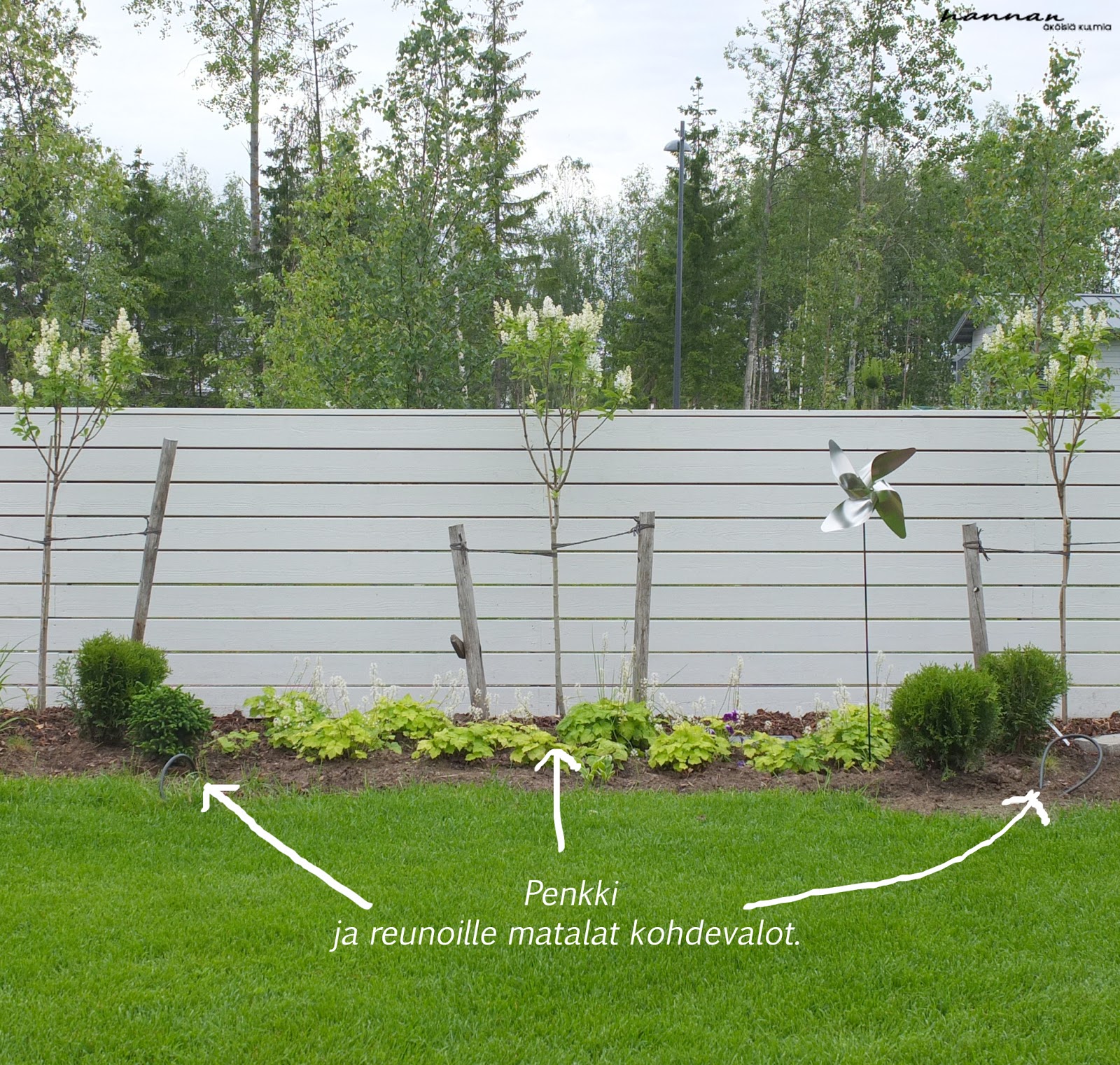 Olen iloinen rungollisten syreenien rivistä, joka nyt, kun aitakin on valmis, näyttää kivan särmältä. Sen alle olen istuttanut heinämäisiä pikkutarhanpäivänliljoja ja erilaisia kuunliljoja. Nämä eivät kasva yli 60 cm, jotta syreenien rungot pääsevät aina esille.