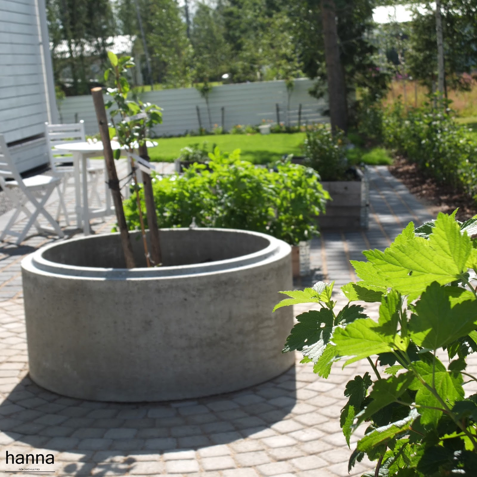 Ruokapuutarhan keskipiste on kaivonrenkaaseen istutettu perheomenapuu (yhteen omenapuunrunkoon on vartettu kolmea eri lajiketta, joten pölytys hoituu näiden välillä). Harmaata kaivonrengasta kehystää harmaat neliönoppakivet, jotka mies onnistui latomaan ympyrän malliin eikä ns. ympyräkiviä tarvittu lainkaan. Tämä keskipiste on sijoitettu portaiden ikkunan alle, joten sitä saa ihailla myös sisältä käsin.